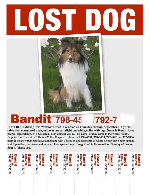 Do large posters 14X21 in very bold print, that could be seen by a passing vehicle, with a telephone number of someone immediately available to check out a sighting. Make it brief, no long explanations on why the dog got loose, etc. No small size signs. You want someone driving by to be able to see the phone number easily, so that if they spot the dog they could call from a cell phone. Put “PLEASE DO NOT CHASE!” on your signs, as a chased sheltie will run like the wind! Try writing big red letters on poster “BELOVED Child’s PET.” Maybe you’ll tug at someone’s heartstrings if they think the dog belongs to a child. We all have this feeling of sadness and helplessness. People almost always will try to help a lost “sheltie”…say “sheltie” on your advertising mode, but also in smaller print say “miniature collie”…because some people are NOT smart enough to know what a sheltie is. We care not about semantics at this point in time, call it a miniature collie!